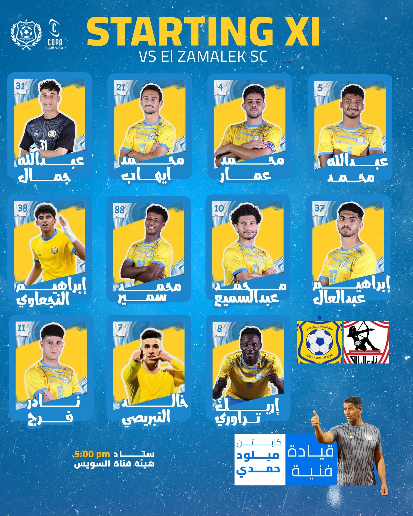 الوسط …محمد عبد السميع، محمد سمير “كونتا” ، إبراهيم عبدالعال، إريك تراوري ،نادر فرج.